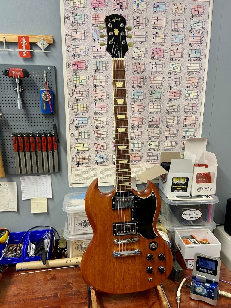 Gibsonin tytäryhtiö Epiphone on valmistanut SG-malleja vastaavaa G-400 -mallistoa vuodesta 1989 lähtien Etelä-Koreassa. Tästä päästäänkin sujuvasti Guitarworxissa huollossa käyneeseen kitaraan, joka on valmistunut jouluussa 2003 Un Sung Musical Instrument Co Ltd:n tehtailla, tuotenumerolla 80. Tämä Etelä-Koreassa (Inchon) sijaitseva tehdas toimi vuosina 1987-2016 niin sanottuna OEM-valmistajana (Original Equipment Manufacturer) useallekin merkille.